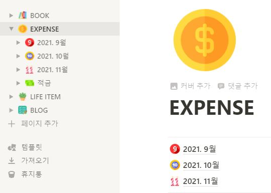 가계부 페이지에 하위 페이지로