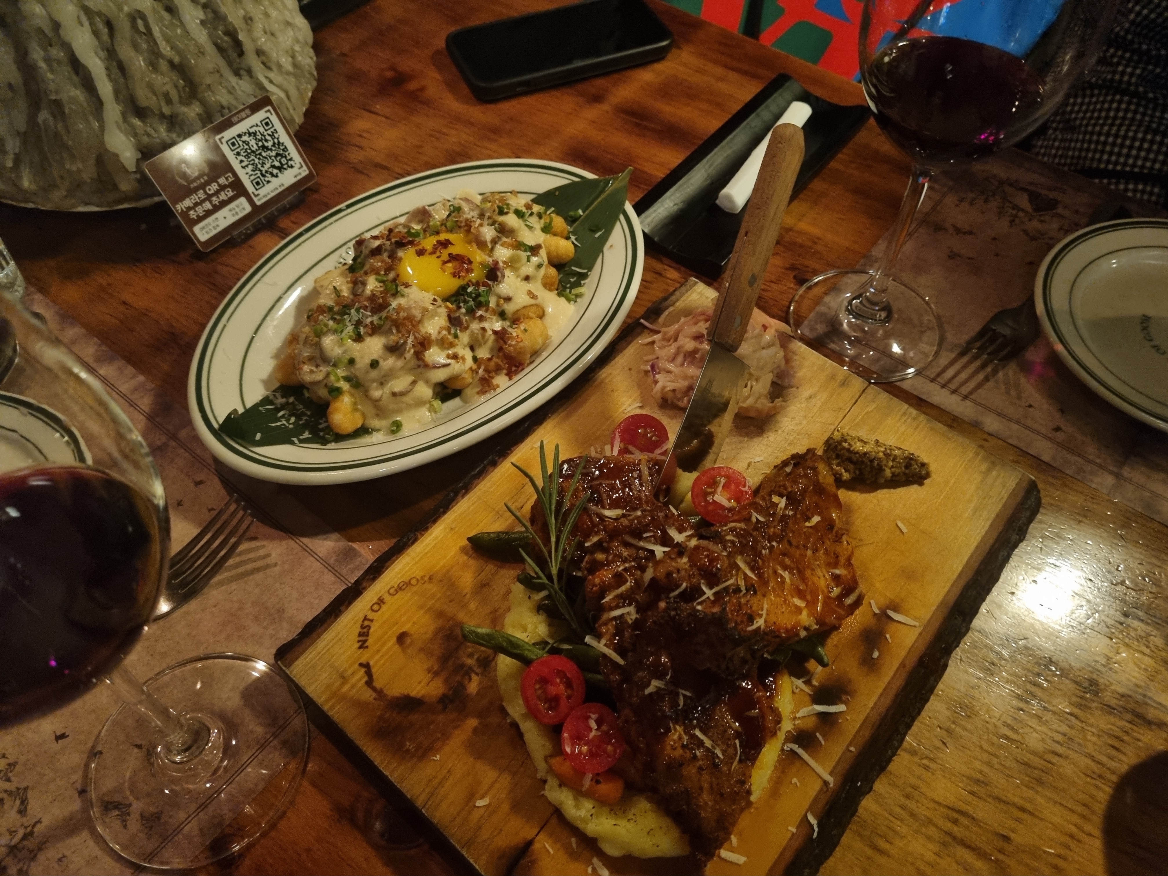 기러기둥지의 시그니처 와인인 기러기둥지 레드와인을 주문했습니다. 와인알못이라서 자세하게 얘기할 순 없지만 너무 무겁지 않고 초보에게도 적당한 맛이었던 것 같아요. 저희는 같은 와인을 2병 마셨습니다.